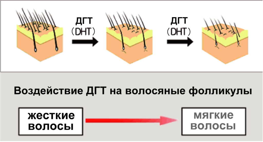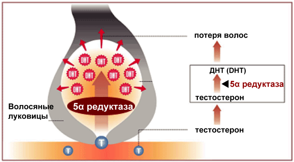 Основным возбудителем АГА (облысения по мужскому типу) является ДГТ (дигидротестостерон) в корне волоса. AGA подтвердила наличие большого количества DHT в области выпадения волос. DHT производится из мужского гормона тестостерона с помощью 5α-редуктазы, и высокие уровни этого DHT завершают фазу роста волос. В результате волосы отрываются до того, как превращаются в густые, а многие тонкие и короткие волосы становятся тонкими.